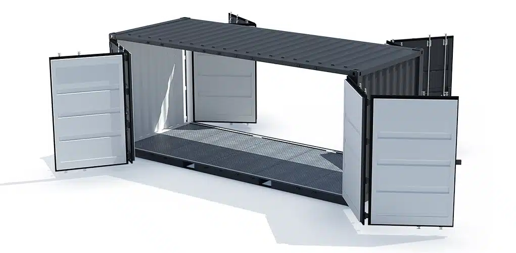 La structure des containers open side double portes est en profil d’acier d’épaisseur 4 mm. Aussi, les parois et plafonds sont en acier profilé d’épaisseur 1,5 mm dotés de prises d’air. Ils disposent de 2 portes à 4 battants sur la longueur avec système anti-effraction. De plus, l’élingage d’un stockage double portes est possible grâce à la présence de 4 coins ISO.