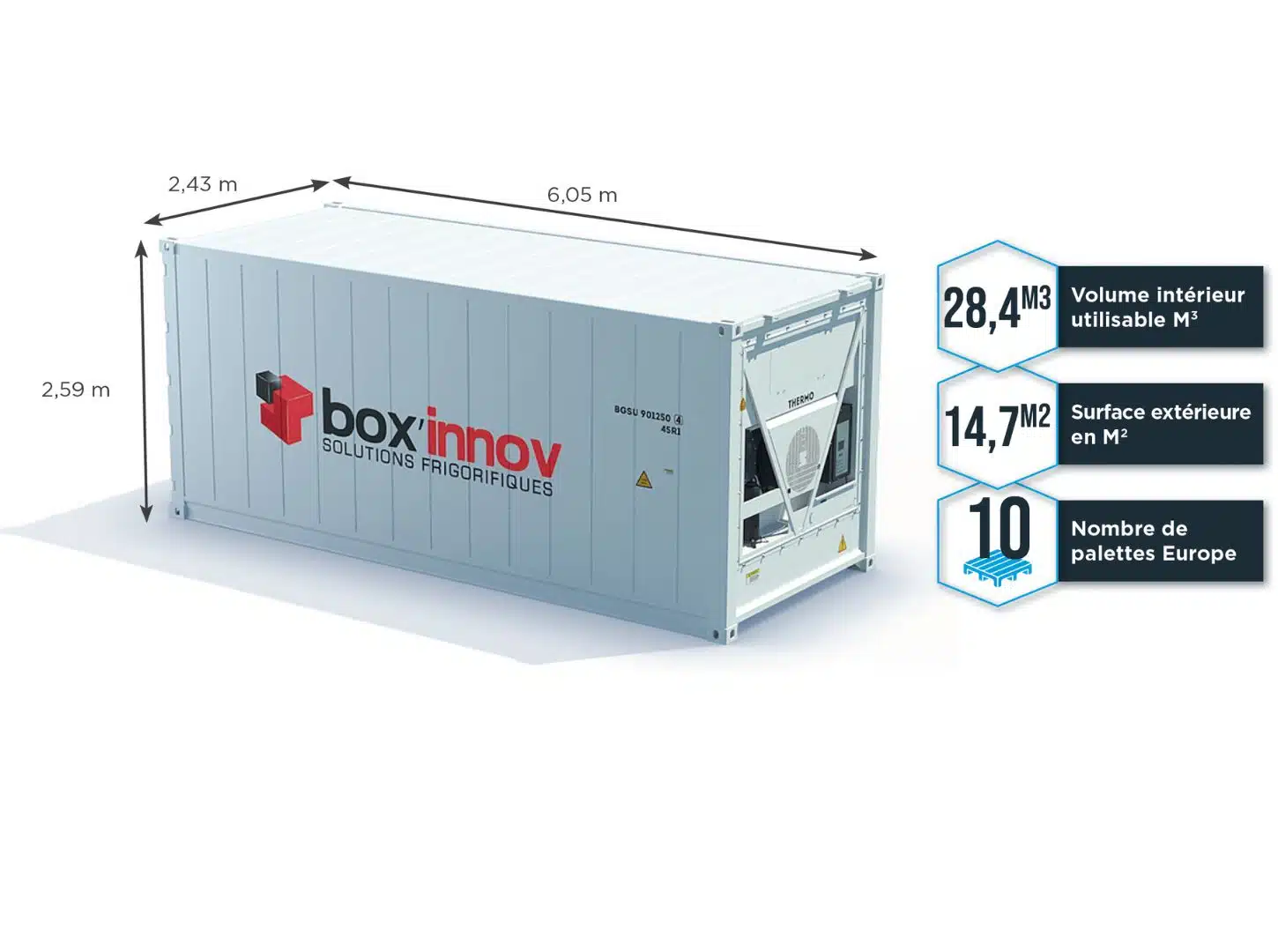 - Dimensions extérieures : longueur 6,05 m, largeur 2,43 m, hauteur 2,59 m